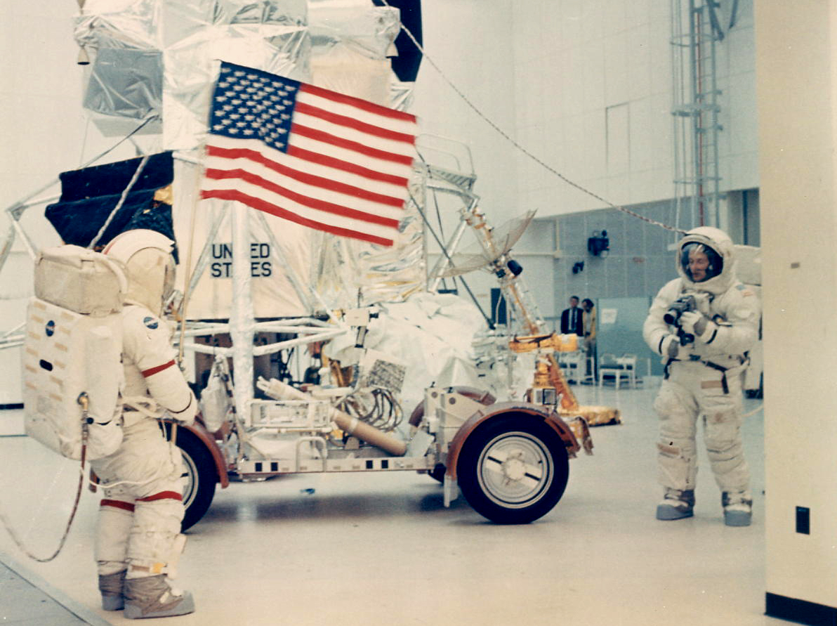 Astronauts John W. Young, left, Apollo 16 Command, and Charles M. Duke, Jr., lunar module pilot, go through an extravehicular activity (EVA) simulation/training exercise in full suit at the Kennedy Space Center (KSC). An earth-adapted model of the Lunar Roving Vehicle (LRV) and Lunar Module (LM) are in the near background.
