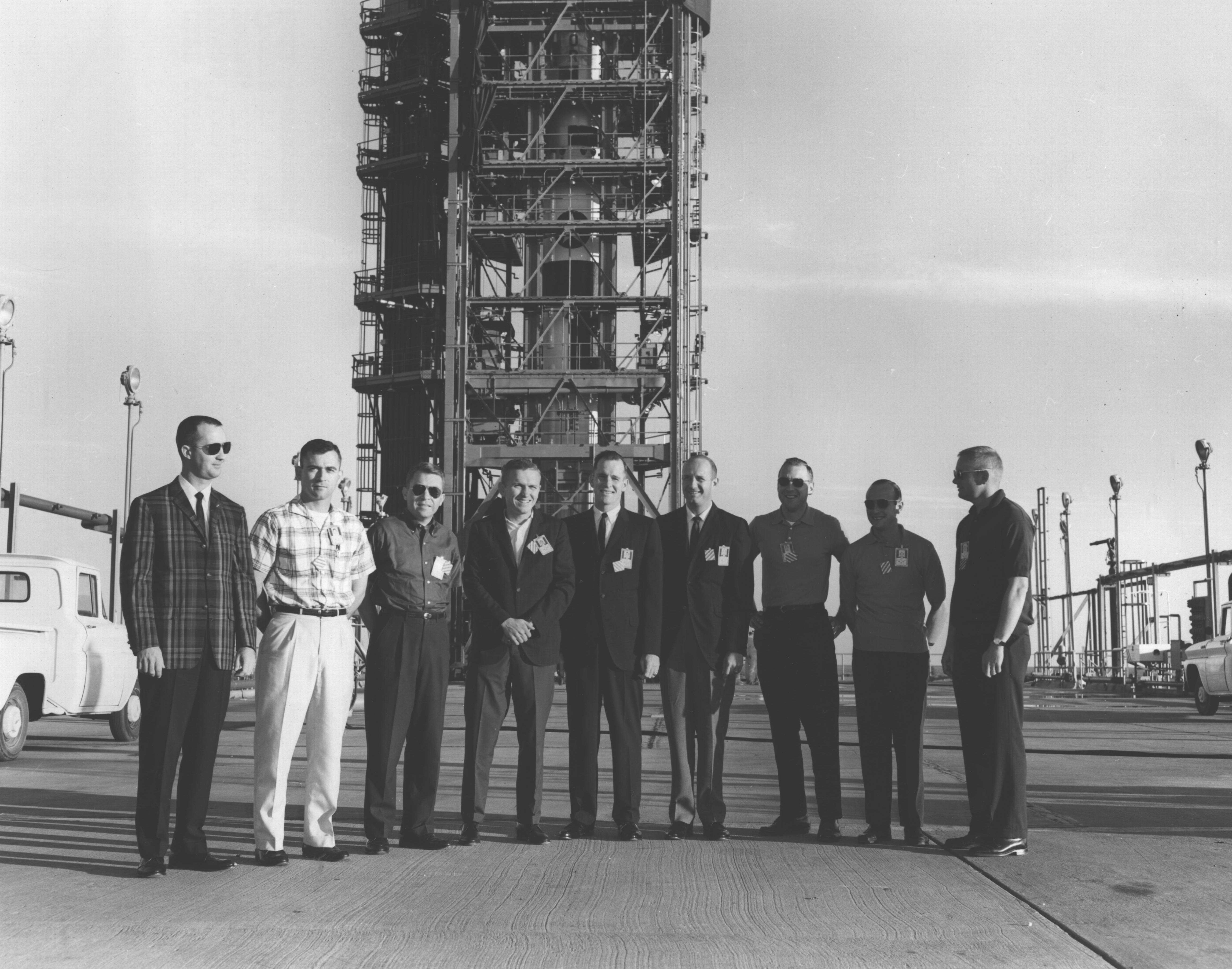The nine new Astronauts visit Complex 20, Titan launch pad. Left to right: James A. McDivitt, John W. Young, Elliott M. See, Jr., Frank Borman, Edward H.White II, Thomas P.Stafford, James A. Lovell, Jr., Charles Conrad, Jr., Neil Armstrong.
