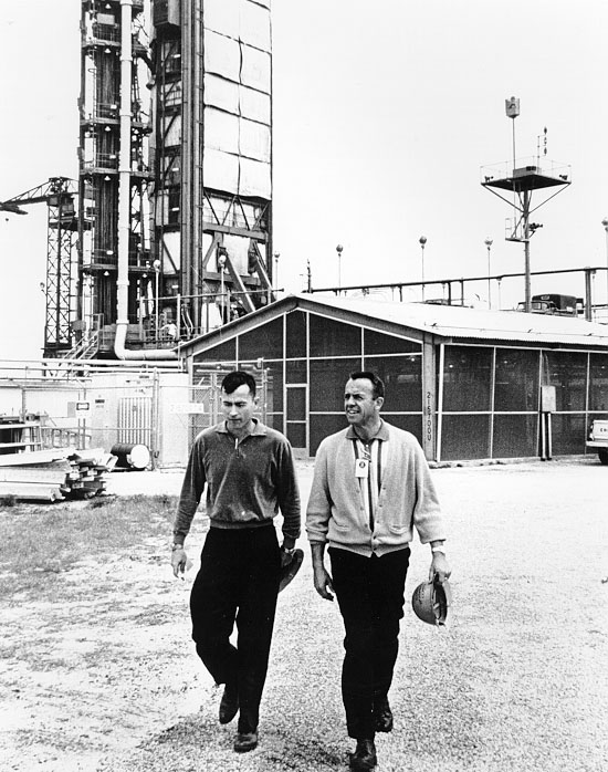 John Young and Alan Shepard surveying the area around Pad 19 before the Gemini 3 launch. NASA Photo ID: 65-H-428 Date: 3-22-65