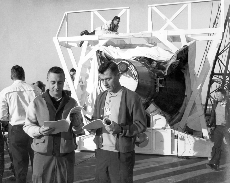 Astronaut Virgil I. Grissom (left), the command pilot, and John W. Young, the co-pilot, are shown discussing test plan prior to entering the Gemini Spacecraft 3 for communications test at the Merritt Island Test area.