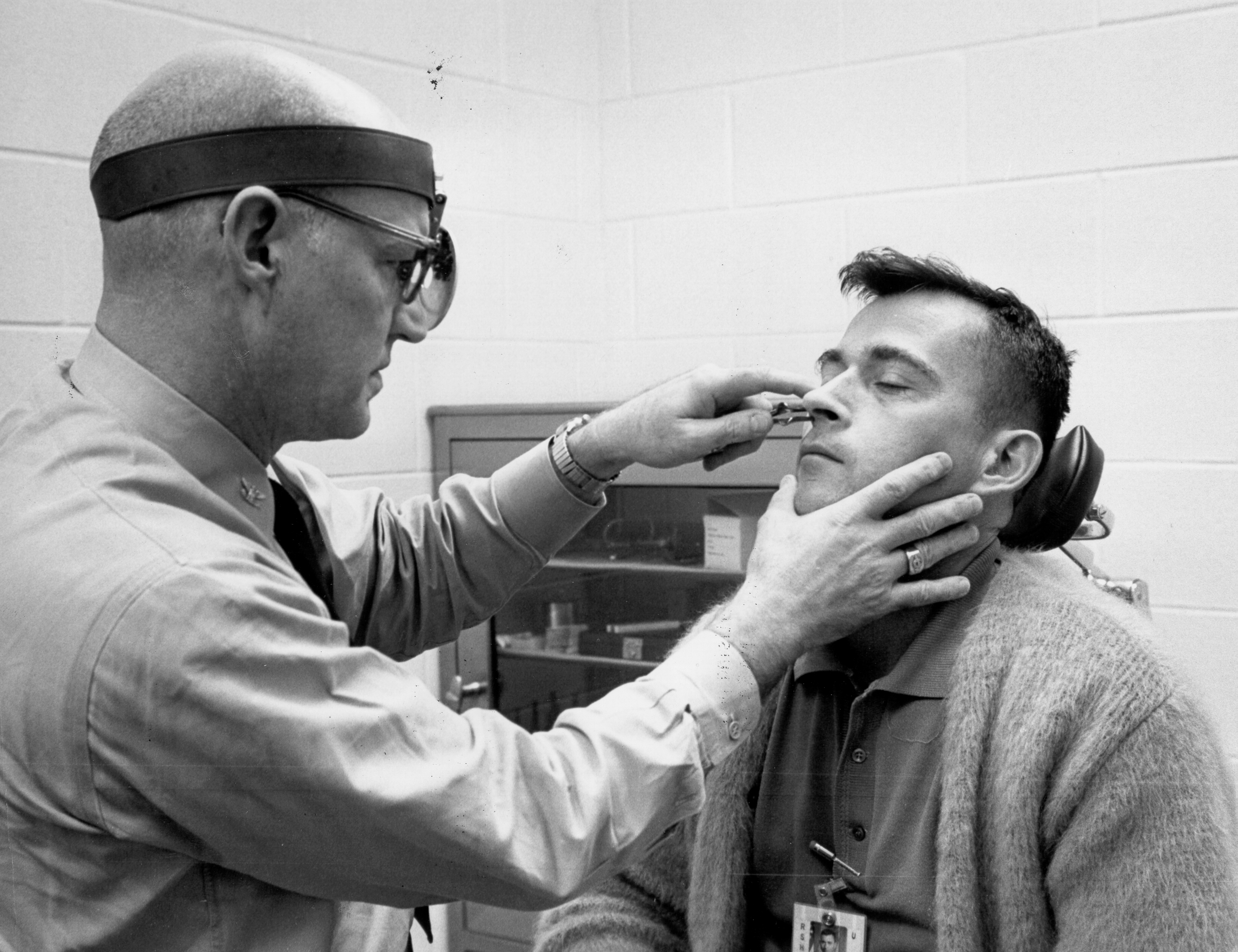 Astronaut John W. Young, pilot for the National Aeronautics and Space Administration's GT-3 flight is administered an ear, nose and throat examination by Dr. L. Ballenberfer, US Navy.