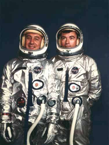 Astronauts Virgil Grissom and John Young dressed in pressure suits.