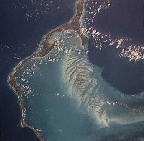 Eleuthera Island, (24.5N, 76.0W) Bahamas Island Group, is one of several within the archipelago surrounded by shallow seas, visible here as light blue. Mosaic patterns of sand waves built by sea bottom currents in the shallows stand out in stark contrast to the deep blue of the ocean depths of a thousand feet in the Exuma Sound.